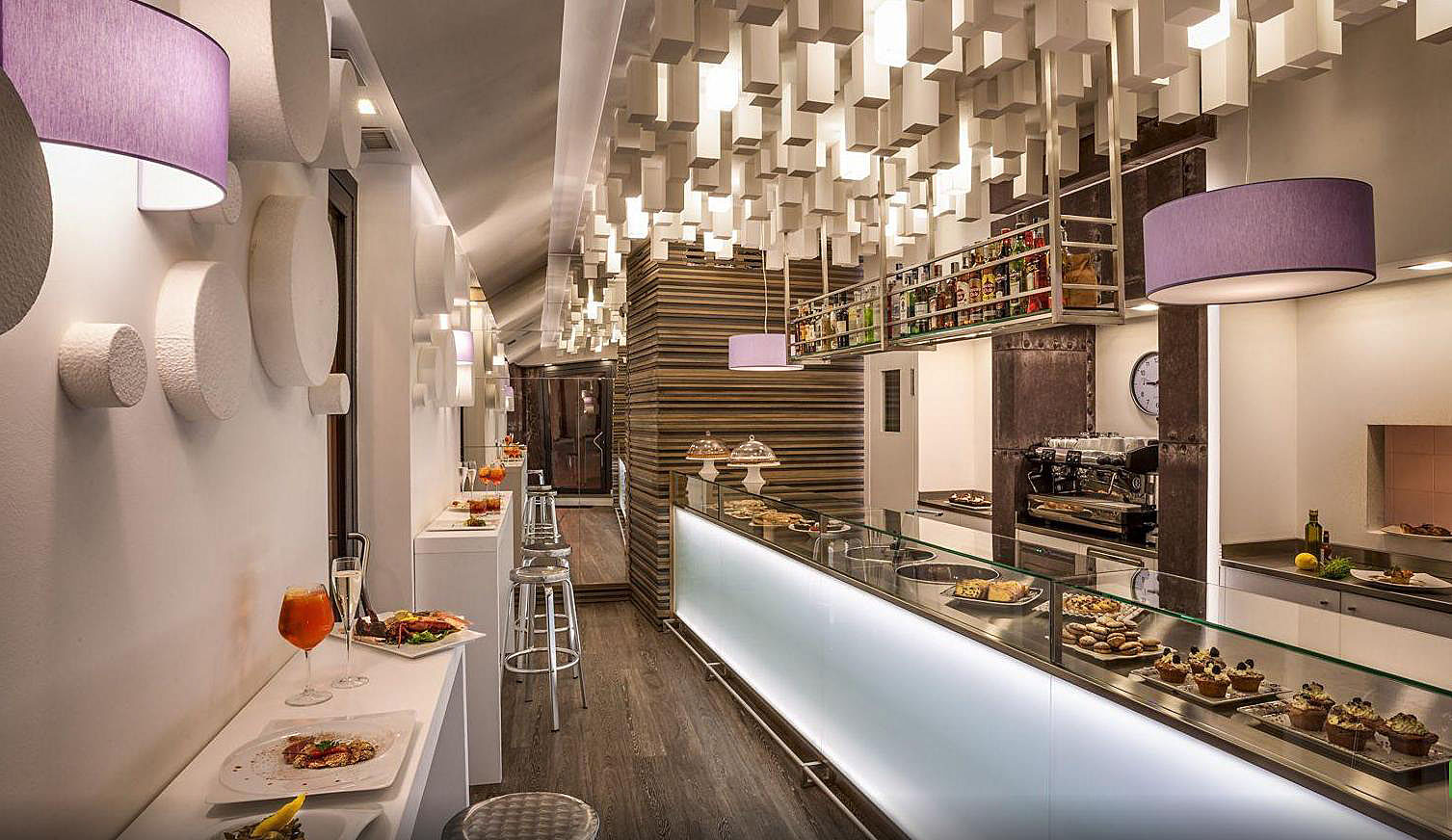 Allestimento bancone per locale commerciale parete 3D in sughero